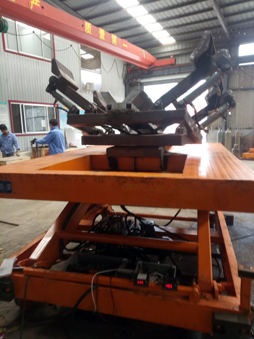 流水線使用,道軌行走液壓升降平臺,臺面安裝有,自動化收縮臂,可根據工件的受力大小能力,自動調節收緊力,保證工作中不會把工件損壞